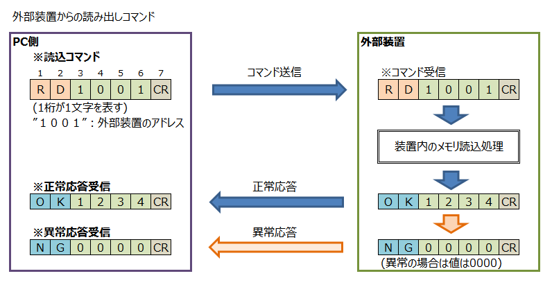 今回の例は、下図の様なPLCからのデータ読み出しと書込みの簡単なコマンドを想定しています。読み出しコマンドも書き込みコマンドも、最初にPLC側にコマンドを送信し、結果を受信することを想定しています。