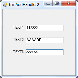 Public Class frmAddHandler2 ' フォームロードイベント Private Sub frmAddHandler_Load(sender As Object, e As EventArgs) Handles Me.Load 'コントロールへのイベントハンドラ関連付け Call Me.SetEvent(Me.Controls) 'フォームがすべてのキー イベントを受け取る Me.KeyPreview = True End Sub ' コントロールへのイベントハンドラ関連付け ' param CtrlColl :コントロールコレクション Private Sub SetEvent(ByVal CtrlColl As Control.ControlCollection) 'コントロール変数 Dim objControl As Control 'テキストボックスコントロール変数 Dim objTextBox As TextBox 'コントロールがある分だけループ For Each objControl In CtrlColl If TypeOf objControl Is TextBox Then 'テキストボックスコントロールに変換 objTextBox = DirectCast(objControl, TextBox) 'Enterイベントの関連付け AddHandler objTextBox.Enter, AddressOf CtrlEnterEvent 'Changedイベントの関連付け AddHandler objTextBox.TextChanged, AddressOf CtrlTextChangedEvent 'KeyPressイベントの関連付け AddHandler objTextBox.KeyPress, AddressOf CtrlTextKeyPressEvent Else End If Next End Sub ' コントロールのEnterイベント処理 Private Sub CtrlEnterEvent(ByVal sender As Object, ByVal e As System.EventArgs) If TypeOf sender Is TextBox Then 'TextBoxのとき DirectCast(sender, TextBox).SelectAll() End If End Sub ' コントロールのTextChangedイベント処理 Private Sub CtrlTextChangedEvent(ByVal sender As Object, ByVal e As System.EventArgs) If TypeOf sender Is TextBox Then 'TextBoxのとき Dim objTextBox As TextBox = DirectCast(sender, TextBox) '仮の処理として表示内容をTagに退避 objTextBox.Tag = objTextBox.Text End If End Sub ' コントロールのKeyPressイベント処理(1カ所で集中管理する) Private Sub CtrlTextKeyPressEvent(ByVal sender As Object, ByVal e As System.Windows.Forms.KeyPressEventArgs) 'コントロールの名前により処理を分ける Select Case sender.name Case "TextBox1" '[TextBox1]は数字のみ入力とする If Not ("0" <= e.KeyChar And e.KeyChar <= "9") Then e.Handled = True End If Case "TextBox2" '[TextBox2]は英字大文字の A ~ Z のみ入力とする If Not ("A" <= e.KeyChar And e.KeyChar <= "Z") Then e.Handled = True End If Case "TextBox3" '[TextBox3]は英字子文字の a ~ z のみ入力とする If Not ("a" <= e.KeyChar And e.KeyChar <= "z") Then e.Handled = True End If End Select End Sub ' フォームKeyDownイベント Private Sub frmEnterNext_KeyDown(ByVal sender As Object, _ ByVal e As System.Windows.Forms.KeyEventArgs) Handles MyBase.KeyDown If e.KeyCode = Keys.Enter Then If e.Control = False Then '[Enter]キーで次の TabIndex があるコントロールへフォーカスを移す Me.SelectNextControl(Me.ActiveControl, Not e.Shift, True, True, True) End If End If End Sub ' フォームKeyPressイベント Private Sub frmEnterNext_KeyPress(ByVal sender As Object, _ ByVal e As System.Windows.Forms.KeyPressEventArgs) Handles MyBase.KeyPress If e.KeyChar = ControlChars.Cr Then '[Enter]キーで音が出るので、キーイベントが処理されたことにして音を消す e.Handled = True End If End Sub End Class