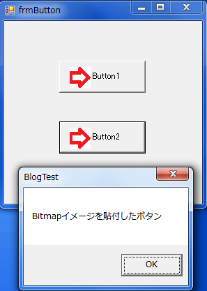 次は、上記で張り付けたボタンのコピーをフォーム上で行います。 第2のボタンから最初のボタンクリックを呼出します。Public Class frmButton Private Sub Button1_Click(sender As Object, e As EventArgs) Handles Button1.Click MsgBox("Bitmapイメージを貼付したボタン") End Sub Private Sub Button2_Click(sender As Object, e As EventArgs) Handles Button2.Click '別のボタンからクリックイベントを起動 Me.Button1.PerformClick() End Sub End Classこれを実行すると以下の様な表示になります。(下図は Button2 をクリックしたところです)