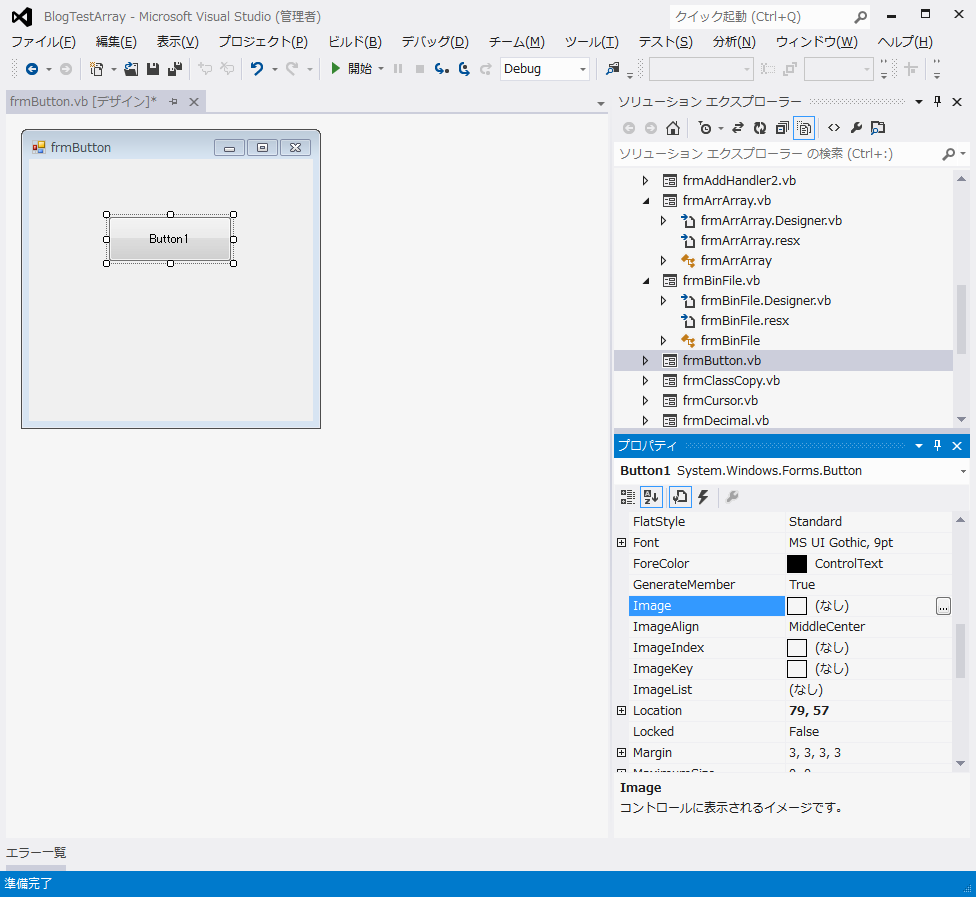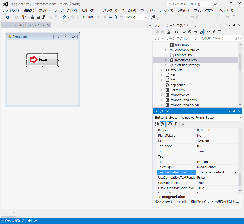 そのボタンの Image プロパティに画像が設定されたことが分かります。 ここで TextImageRelation プロパティを適当な値(今回は ImageBeforeText)に設定します。 そうしますと左側のデザイン画面にも画像が表示されます。