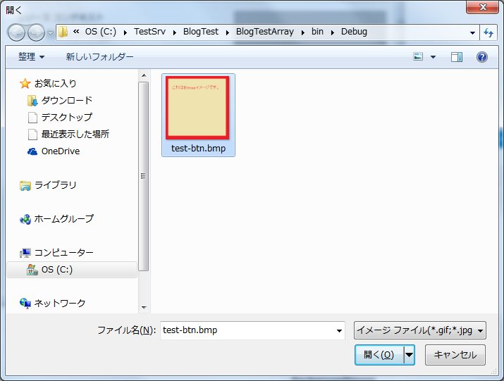 以下のファイル選択ダイアログが開きますので、そこでペイント等の画像ソフトで作成しておいた画像ファイルを指定します。 (今回は簡単な四角い画像のファイルを作成しました)このダイアログの「開く」をクリックすると以下の様に画像がリストに反映されます。 さらに、「OK」をクリックします。