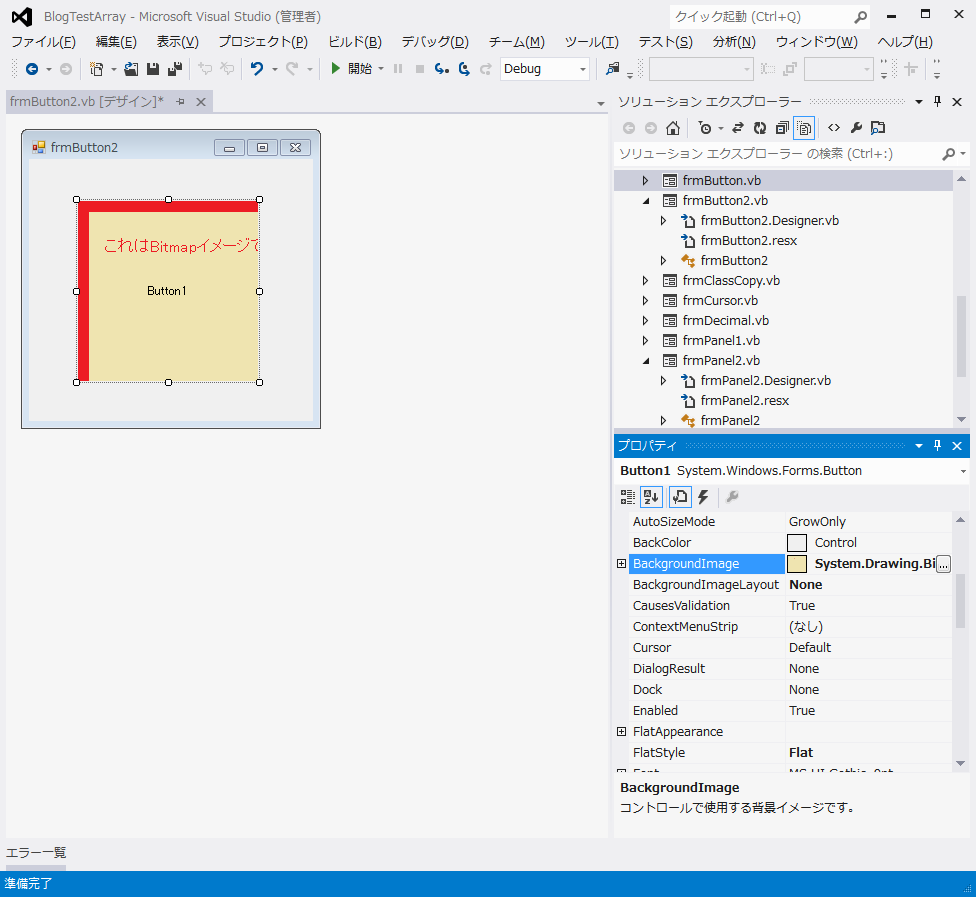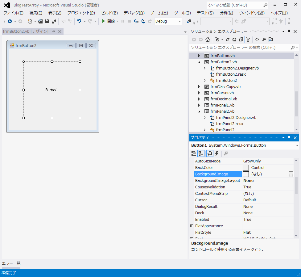そのボタンの BackgroundImage プロパティに画像が設定されたことが分かります。 ここで FlatStyle プロパティを Flat に設定します。 そうしますと左側のデザイン画面にも画像が表示されます。