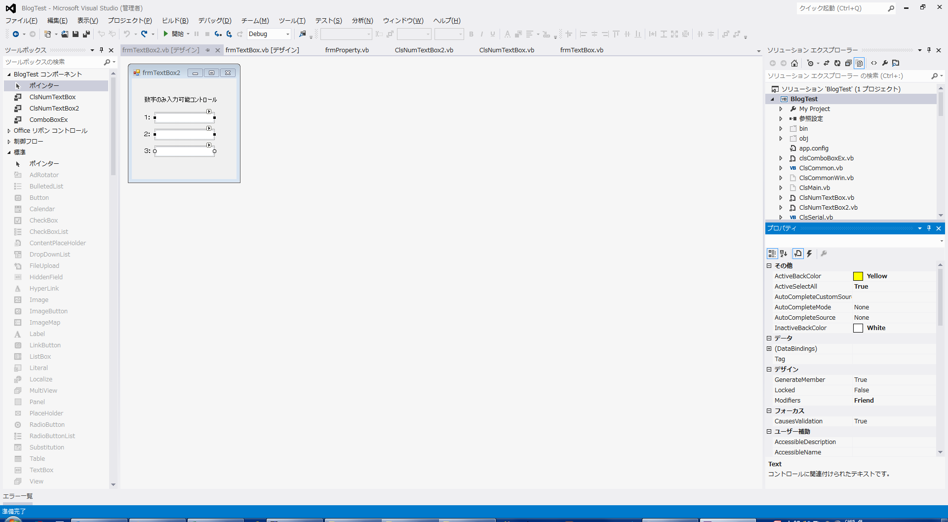 Public Class ClsNumTextBox2 Inherits TextBox 'アクティブ時の背景色 Private _ActiveBackColor As Color = Color.White '非アクティブ時の背景色 Private _InactiveBackColor As Color = Color.White 'アクティブ時の全選択フラグ Private _ActiveSelectAll As Boolean = False 'クリップボード貼付メッセージ Const WM_PASTE As Integer = &H302 '''''' WndProc メソッド (override) ''' ''' <param name="m">メッセージ</param> Protected Overrides Sub WndProc(ByRef m As Message) Select Case m.Msg Case WM_PASTE Dim iDataObj As IDataObject = Clipboard.GetDataObject() 'クリップボードの中身があるか、かつ文字列に変換できるか?? If (iDataObj IsNot Nothing) And (iDataObj.GetDataPresent(DataFormats.Text) = True) Then '文字列に変換 Dim strClip As String = DirectCast(iDataObj.GetData(DataFormats.Text), String) '文字列が数字のみか調べる If Me.ChkClipString(strClip) = False Then Return End If End If End Select 'メッセージのデフォルト処理を呼出す MyBase.WndProc(m) End Sub '''''' コンストラクタ ''' Public Sub New() MyBase.New() 'IMEを無効にする MyBase.ImeMode = ImeMode.Disable End Sub '''''' アクティブ時の背景色 ''' Public Property ActiveBackColor As Color Set(value As Color) _ActiveBackColor = value '退避値に設定 End Set Get Return _ActiveBackColor '退避値を返す End Get End Property '''''' 非アクティブ時の背景色 ''' Public Property InactiveBackColor As Color Set(value As Color) _InactiveBackColor = value '退避値に設定 End Set Get Return _InactiveBackColor '退避値を返す End Get End Property '''''' アクティブ時の全選択フラグ ''' Public Property ActiveSelectAll As Boolean Set(value As Boolean) _ActiveSelectAll = value '退避値に設定 End Set Get Return _ActiveSelectAll '退避値を返す End Get End Property '''''' Enterイベントの処理 ''' Protected Overrides Sub OnEnter(e As EventArgs) MyBase.OnEnter(e) '背景色の設定 Me.BackColor = Me._ActiveBackColor 'アクティブ時の全選択フラグ If Me._ActiveSelectAll = True Then Me.SelectAll() End If End Sub '''''' Leaveイベントの処理 ''' Protected Overrides Sub OnLeave(e As EventArgs) MyBase.OnLeave(e) '背景色の設定 Me.BackColor = Me._InactiveBackColor End Sub '''''' KeyPressイベントの処理 ''' Protected Overrides Sub OnKeyPress(e As KeyPressEventArgs) MyBase.OnKeyPress(e) 'キーが [0]~[9] または [BackSpace] 以外の場合イベントをキャンセル If Not (("0"c <= e.KeyChar And e.KeyChar <= "9"c) Or e.KeyChar = ControlChars.Back) Then e.Handled = True End If End Sub '''''' 文字列のチェック関数 ''' ''' <param name="strClip">指定文字列</param> '''True:OK, False:NG Private Function ChkClipString(ByVal strClip As String) As Boolean ChkClipString = False If System.Text.RegularExpressions.Regex.IsMatch(strClip, "^[0-9]+$") Then Return True End If End Function '''''' KeyDownイベントの処理 ''' Protected Overrides Sub OnKeyDown(e As KeyEventArgs) MyBase.OnKeyDown(e) '[Enter]キーの場合 If e.KeyCode = Keys.Enter Then If e.Control = False Then '[Ctrl]キーが押下されていない場合、自分の親のコントロールの次のフォーカスへ移動 Me.Parent.SelectNextControl(Me, Not e.Shift, True, True, True) End If End If End Sub End Classこのソースを別のファイルで作成し、一度コンパイルします。 そうすると、ツールボックスの中に ClsNumTextBox2 が現れますので、以下の様にこれをフォーム上に貼り付けます。