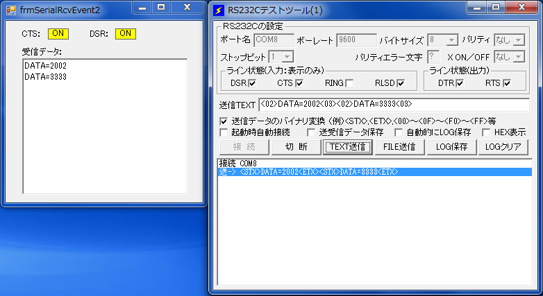 このプログラムを実行すると、以下の様に、「RS232Cテストツール」から連続で2個のデータを送信しても、 それぞれのデータが表示されます。- <STX>DATA=2002<ETX><STX>DATA=3333<ETX>